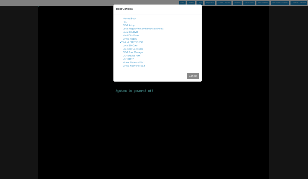 Open the Virtual Console, go to the Boot menu, and select Virtual CD/DVD/ISO. Then, hit Power On.